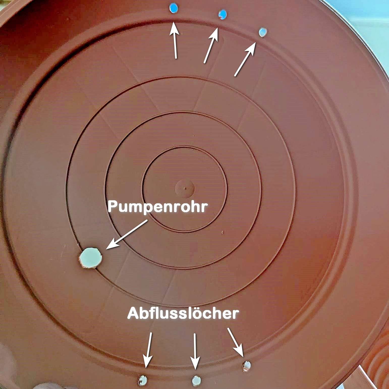 • Zuerst bohrt man in den Untersetzer ein Loch für den Aquarienschlauch bzw. das Düsenrohr und anschließend einige Löcher am Rand zum Ablaufen des Wassers.