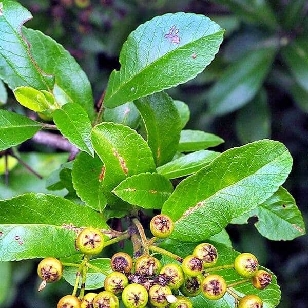 Die Früchte des Feuerdorn (Pyracantha coccinea) ähneln der Vogelbeere stark, besitzt aber im Gegensatz zur Eberesche, wie der Name bereits verrät, Dornen.
