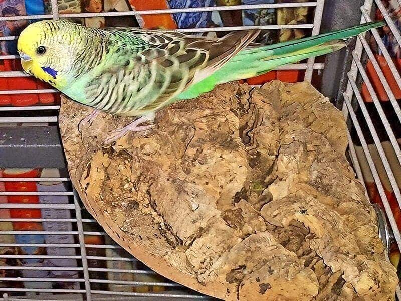 Das Ecksitzbrett aus Kork bietet nicht nur eine große Landefläche und Knabberspaß, sondern schützt auch den Futternapf in der Ecke vor Vogelkot aus höhergelegenen Regionen.