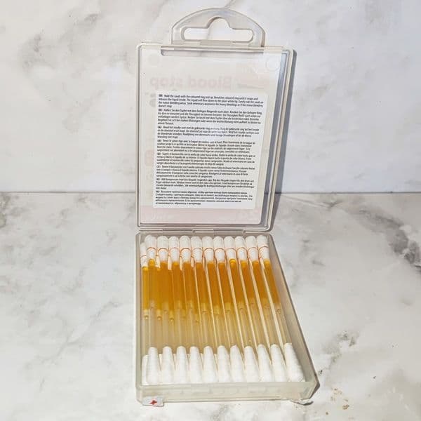 Neben dem Ausüben von Druck mit dem Finger auf die Wunde, empfiehlt es sich noch ein Mittel zur Blutstillung (Eisen-III-Chlorid) zu verwenden: