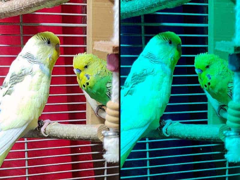 Während das menschliche Auge nur die Farben Rot (565 – 620 Nm), Grün (510 – 540 Nm) und Blau (450 – 480 Nm) wahrnehmen kann, beschränkt sich das Farbspektrum bei Papageien und Sittichen nicht nur auf den Bereich von 400 bis 700 Nm, wie beim Menschen.