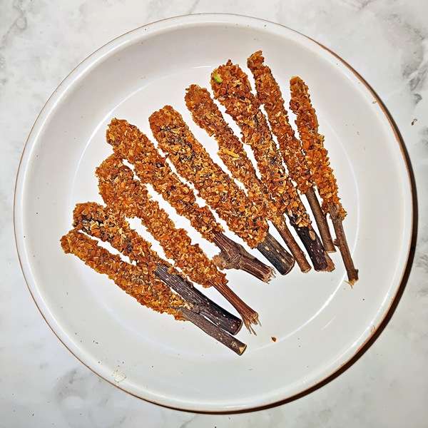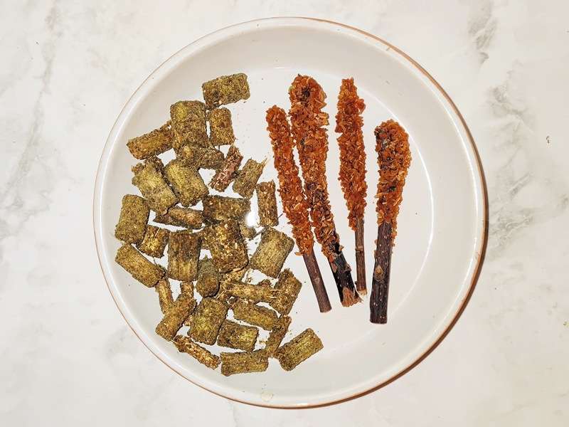 Sittiche knabbern gerne die Rinde von Obstästen ab, die die Grundlage dieses Snacks bilden und erhalten durch die Karottenstückchen darauf zudem ein Plus an Vitamin A. Die Knabberästchen sind somit eine gesunde Beschäftigungsmöglichkeit für Sittiche.