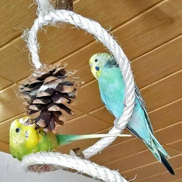 Diese besteht aus einem Sisalseil mit Ø 1,5cm und einem flexiblen Edelstahlkern. Beide Ende sind mit einem Aststück abgeschlossen und können somit auch nicht ausfransen. Die beiden Naturholzenden sowie drei Holzscheiben bieten den Wellensittichen eine zusätzliche Möglichkeit zum Knabbern. Als zusätzlicher Anreiz ist auch noch ein frei pendelnder Kiefernzapfen als widerstandsfähiges Schredderobjekt am Seil befestigt worden.