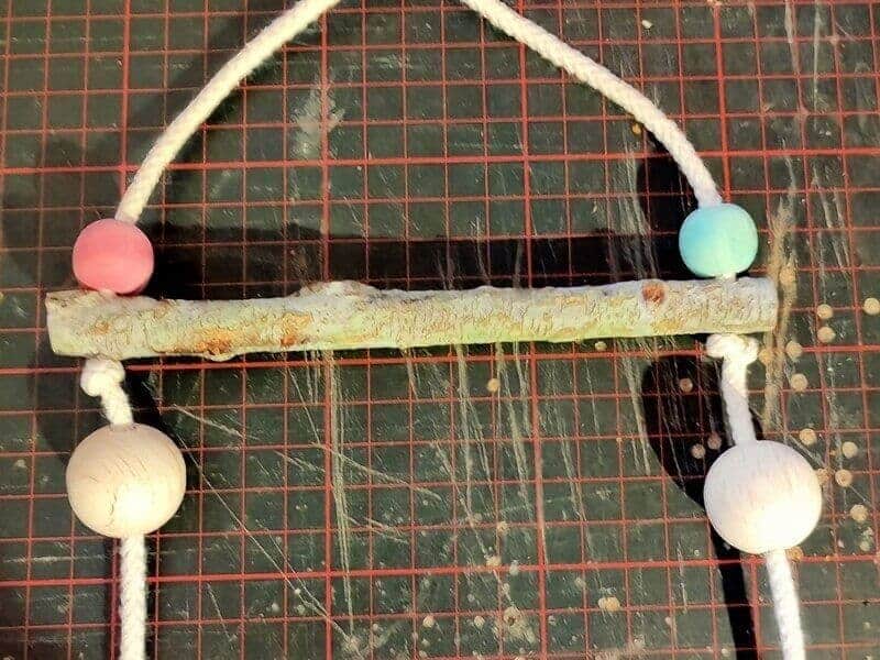 - Nun die Bänder durch die Löcher des unteren Sitzastes stecken, jeweils eine Perle auffädeln und dann diese verknoten und abschneiden.