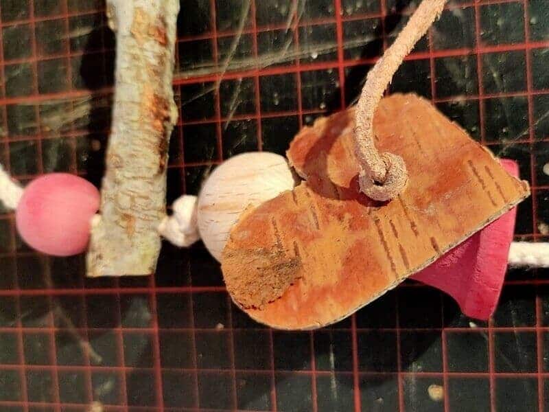 - Danach das Birkenherz auffädeln, das Lederband stramm ziehen, verknoten und abschneiden.