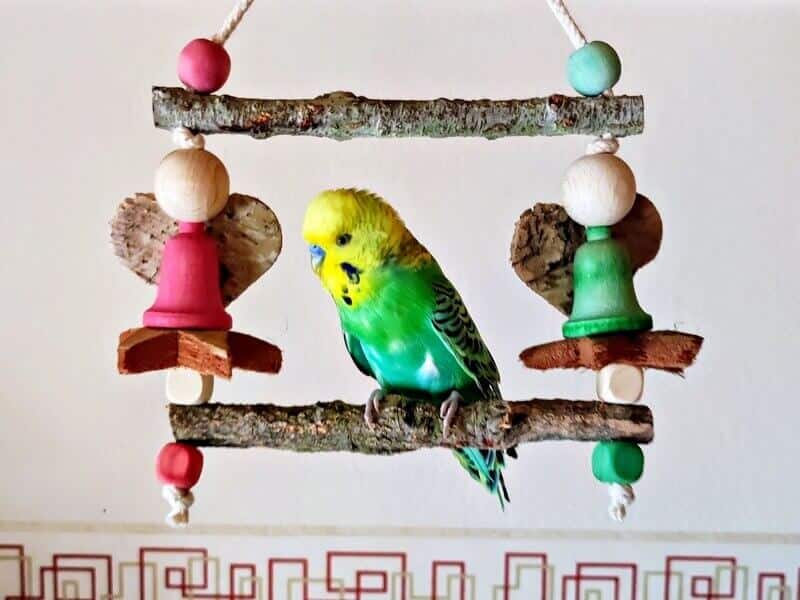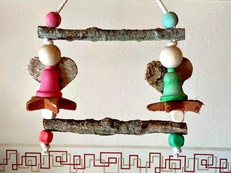 Eine Engelsschaukel mit Sitzästen aus Korkästen oder alternativ Naturholz, die man in der Weihnachtszeit im Freiflugzimmer aufgehängen kann.