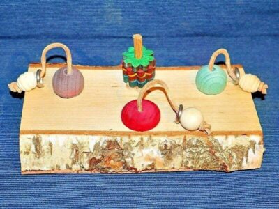 Verschiedene Futterverstecke, bei denen erst die Holzkugeln bzw. das Holzrad heruntergezogen werden müssen. Zusätlich gibt es noch einen Stapel mit Holzblumen zum Spielen.
