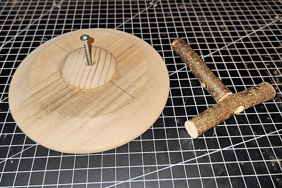 - Zum Schluss die zweite Senkholzschraube von unten durch die Löcher in der Holzplatine und dem Holzteller in den Freisitz schrauben.