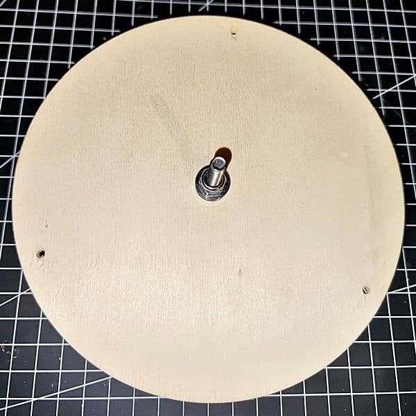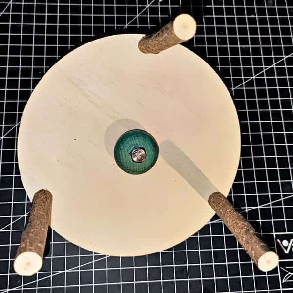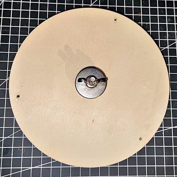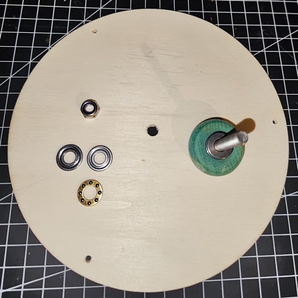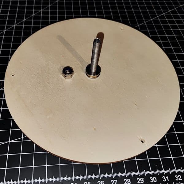 - Kugellager auf die Schraube und diese von .unten durch die Holzscheibe stecken.