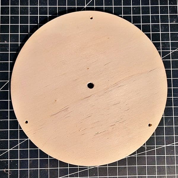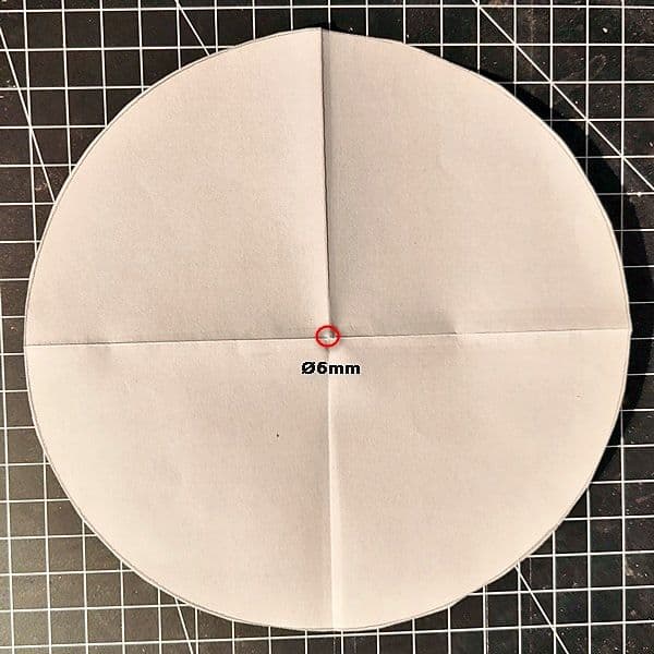 - Schablone auf die Holzscheibe legen und in der Mitte ein Loch mit Ø6mm bohren.