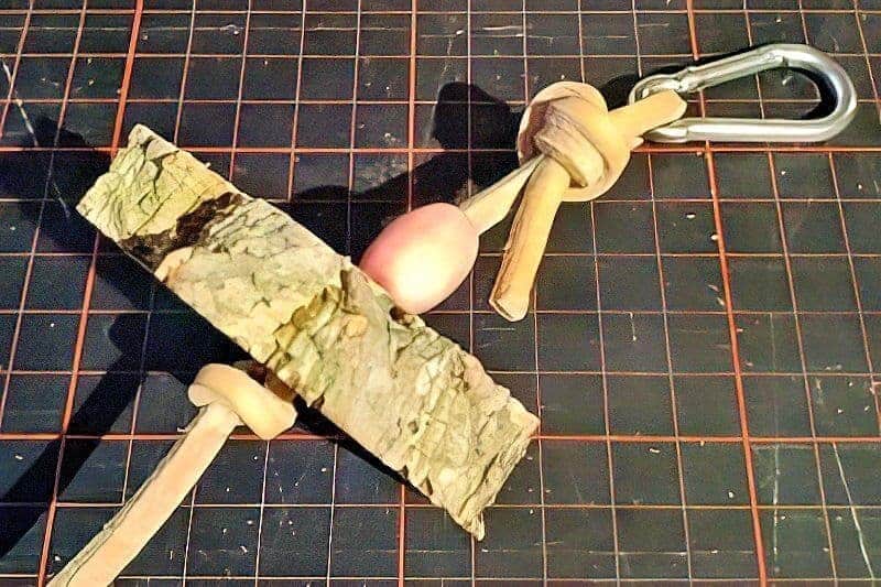 - In das Lederband eine Schlaufe knoten und eine geeignete Holzperle auffädeln. Karabiner in der Schlaufe befestigen.