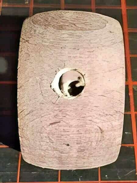 - In die Korkastscheibe mit einem Holzbohrer Ø 6mm vier Löcher für die Baumwollschnur bohren.