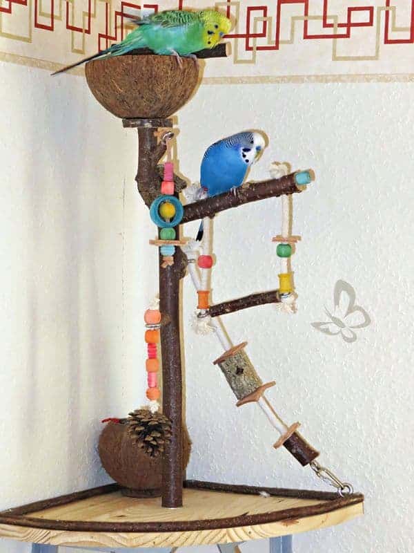 Ein Eckspielplatz für Sittiche, den man mittels Regalwinkeln in eine Zimmerecke an der Wand befestigen kann.