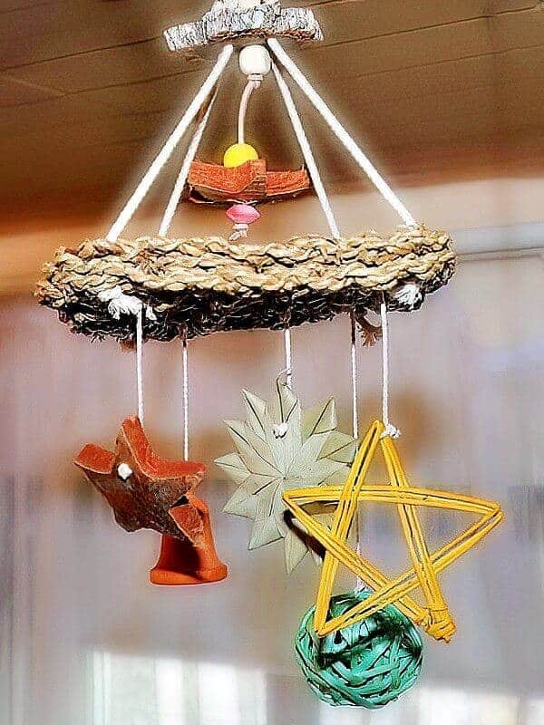 - Den Vorgang wiederholt man dann mit dem Bambusball, der Glocke und den anderen Sternen (siehe Bild). Dabei empfiehlt es sich die Seillänge etwas zu variieren.