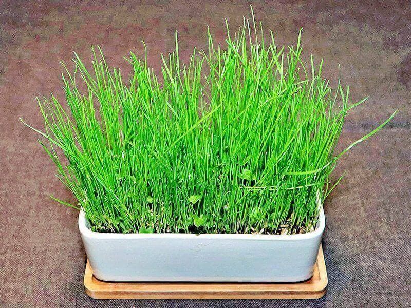 Ein dekorativer Vogelgrasbehälter mit eine Wiesen-Kräuter-Mischung.