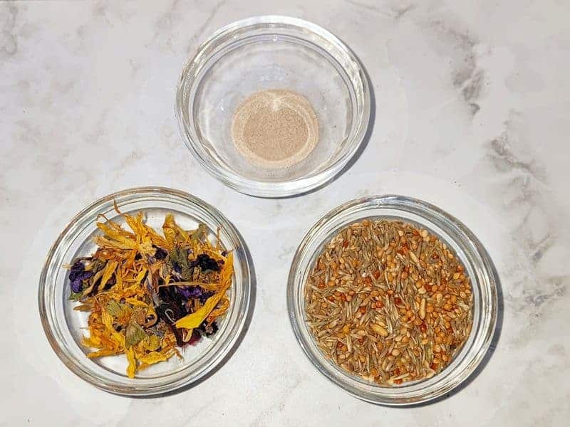 - Körnermischung, Flohsamenschalen und ggf. Kräuter vermengen