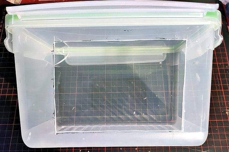 - Den Deckel aufsetzen und die Linien mit dem Teppichmesser vorsichtig einritzen und danach solange nachschneiden bis das Plastik durchtrennt ist. Alternativ kann der Eingang auch mit einer Laubsäge herausgetrennt werden.