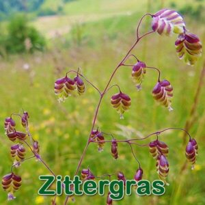 Das Mittlere Zittergras ist eine geeignete Futterpflanze für Vögel, die man leicht an den Rispen hängenden herzförmigen Ährchen erkennt.